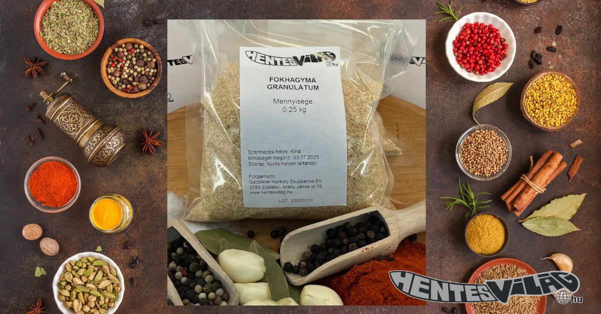 A Fokhagymagranulátum – 250 dkg intenzív, természetes ízt ad minden ételnek. Finom szemcséjű, egyenletesen adagolható fűszer. Kiválóan alkalmas kolbászhoz, szalámihoz és hurkához. Hosszan megőrzi aromáját és frissességét. Könnyen használható, gazdaságos kiszerelésben kapható. Ideális házi és ipari feldolgozáshoz is.